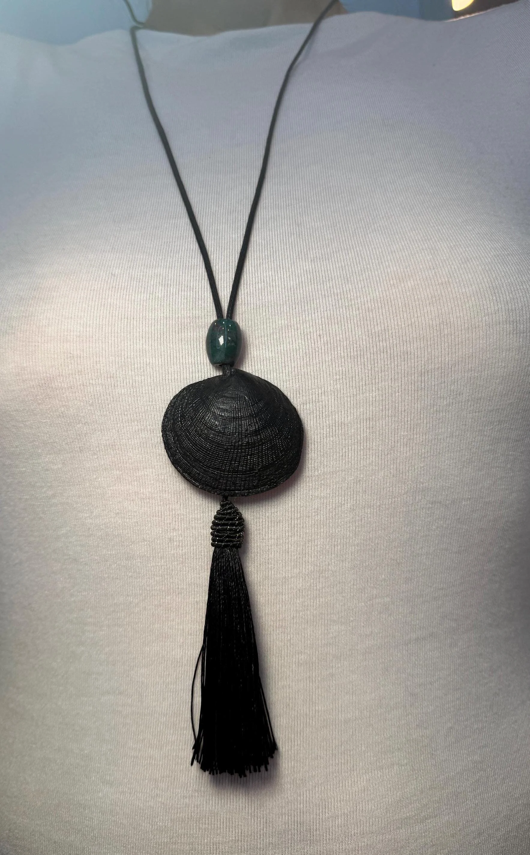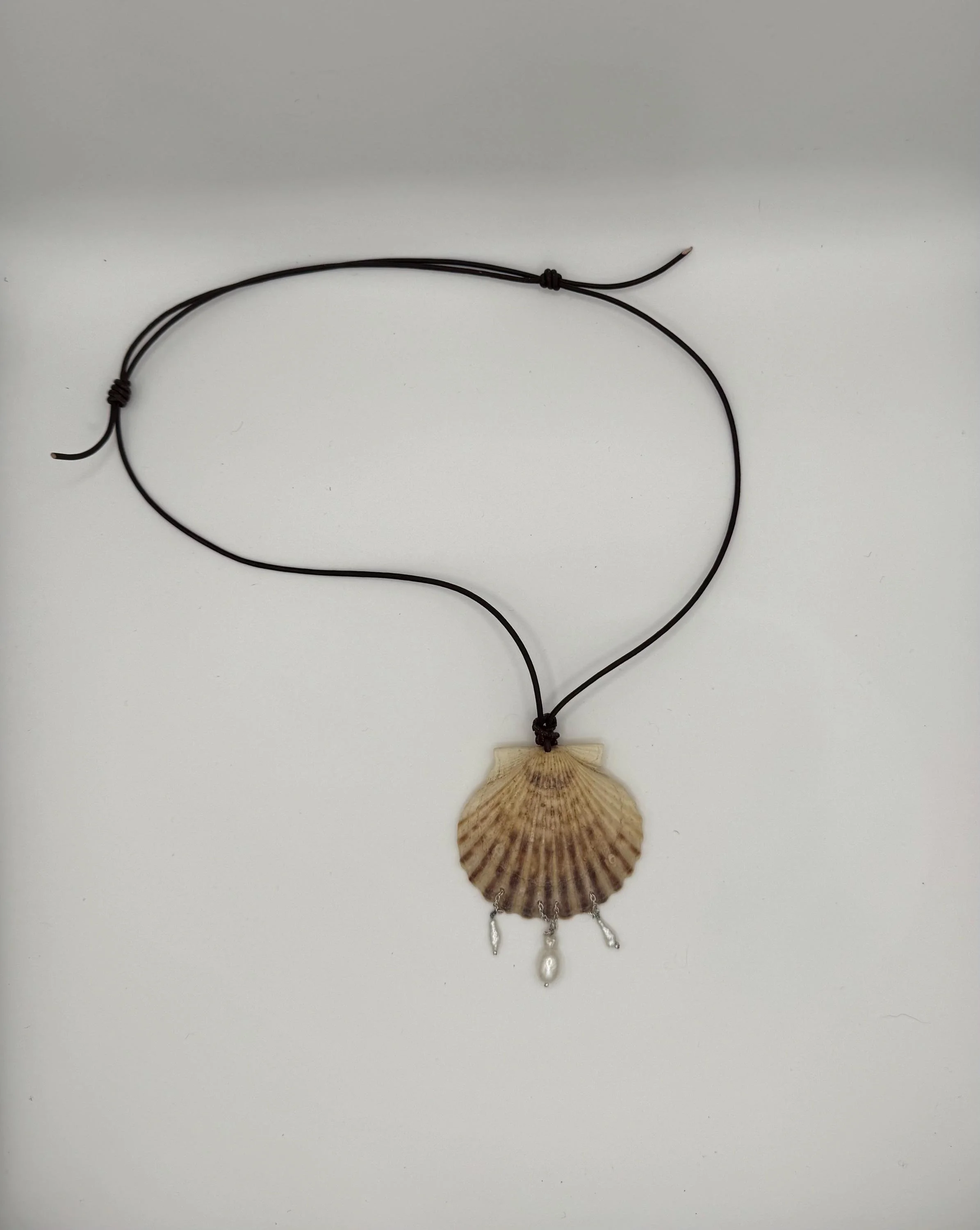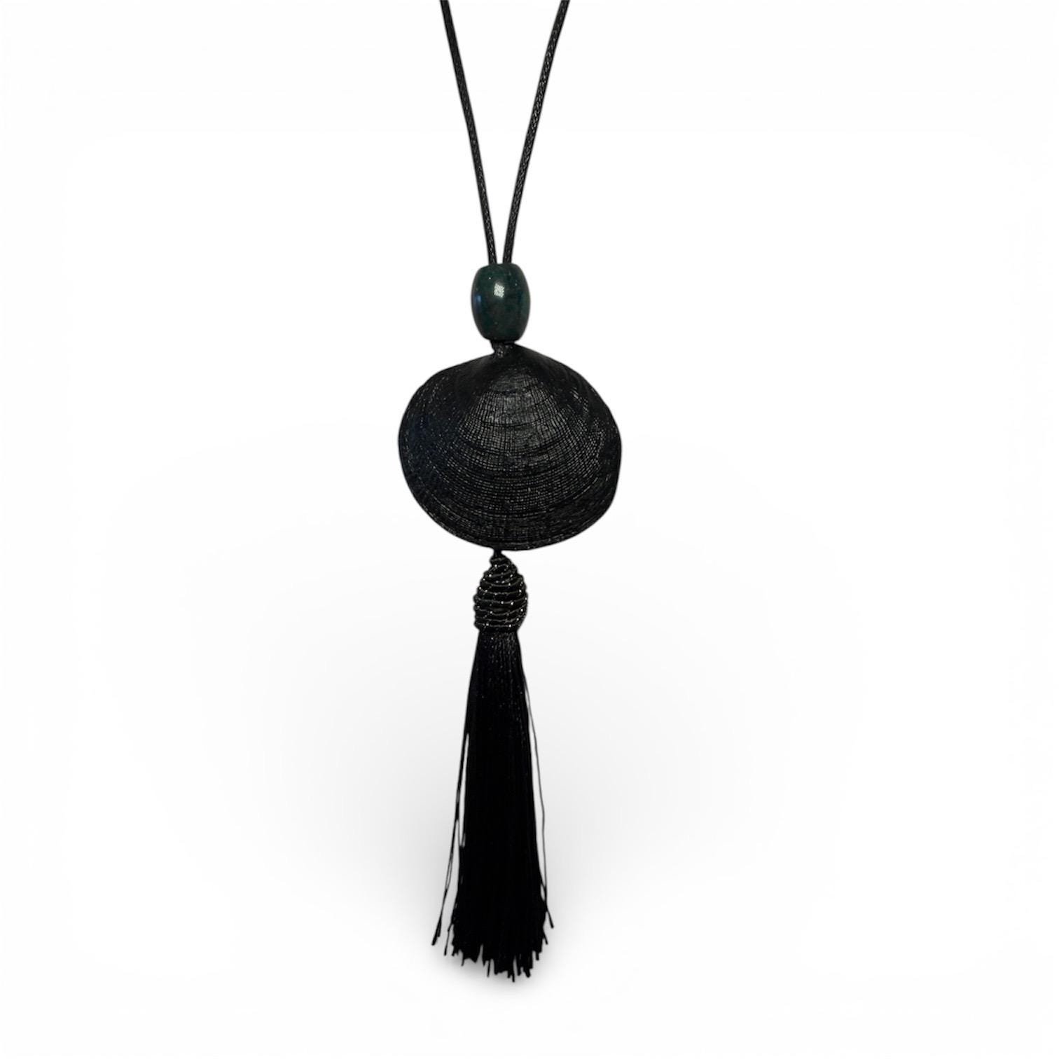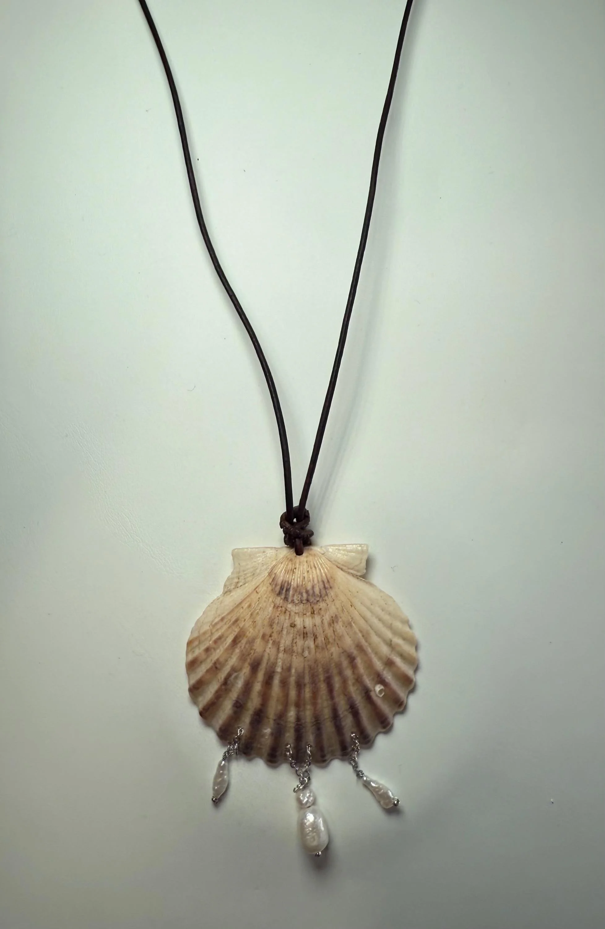 White ark shell pendant statement necklace on real dark brown leather cord. Finished with a pure silk (4”) dark chocolate-brown tassel, connected by a sterling silver jump-ring and black onyx beads.