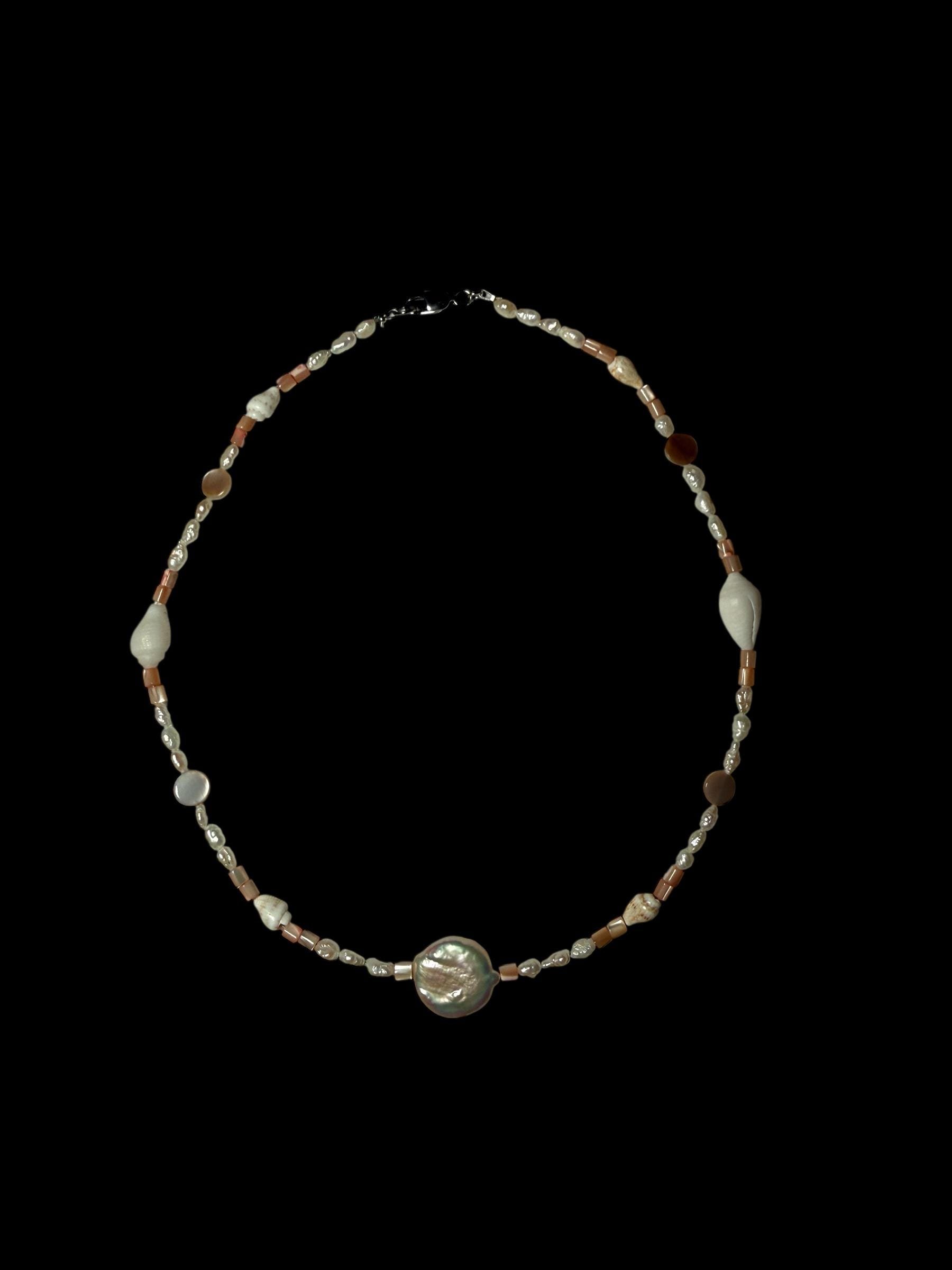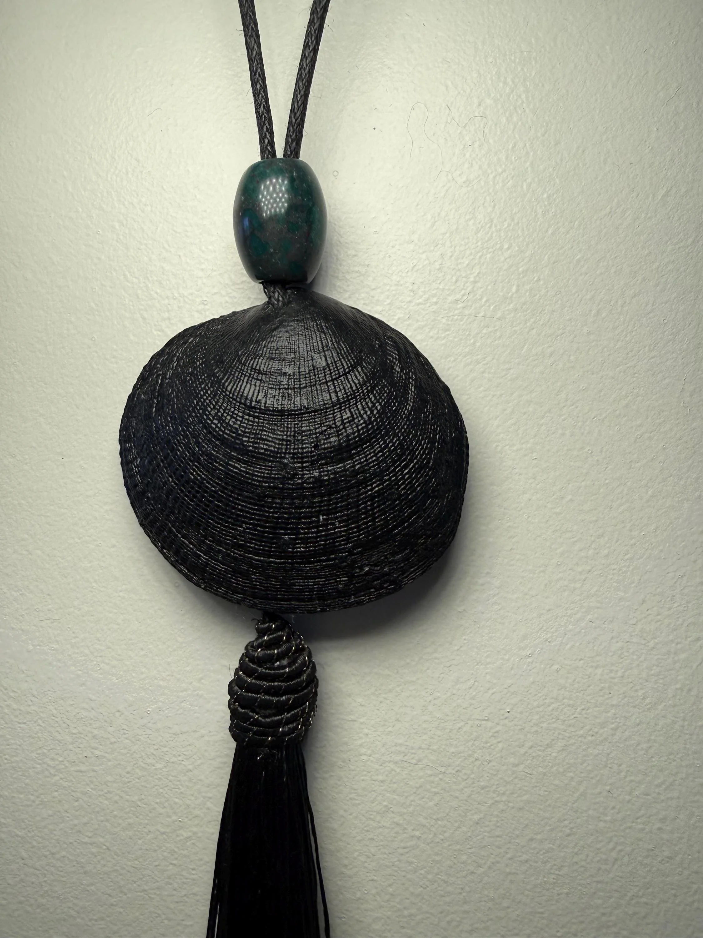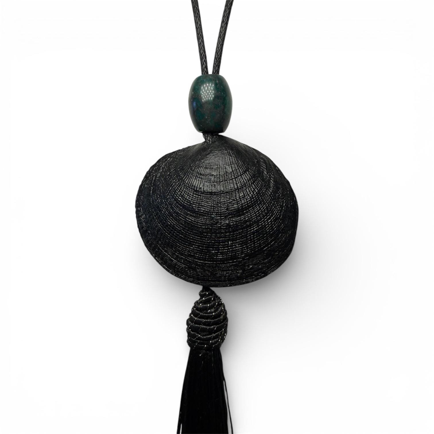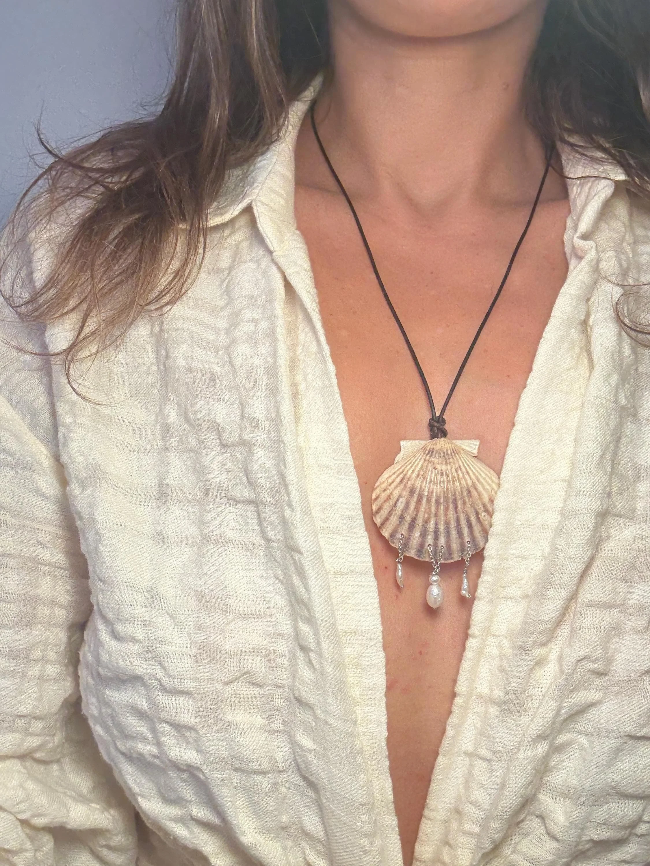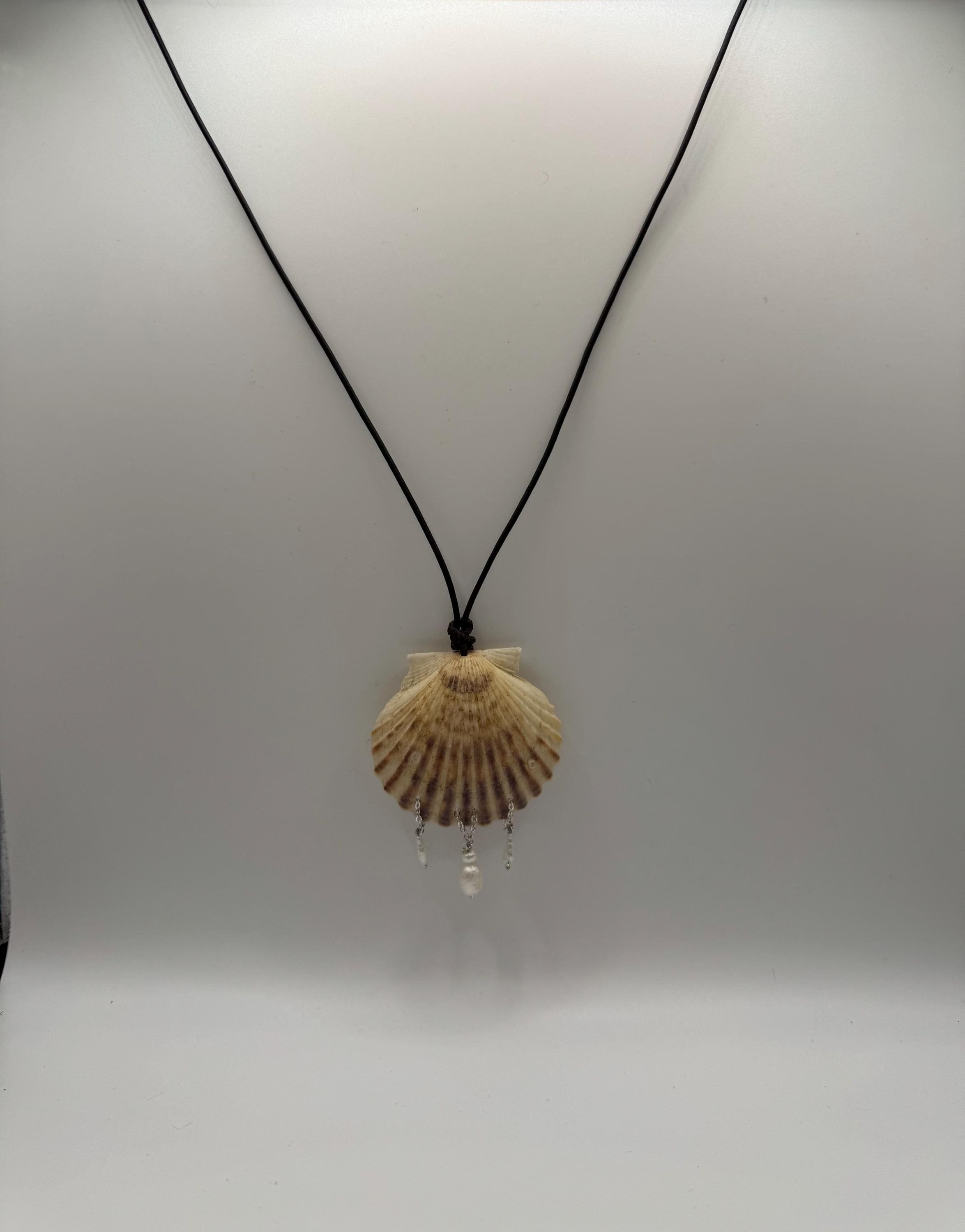 White ark shell pendant statement necklace on real dark brown leather cord. Finished with a pure silk (4”) dark chocolate-brown tassel, connected by a sterling silver jump-ring and black onyx beads.