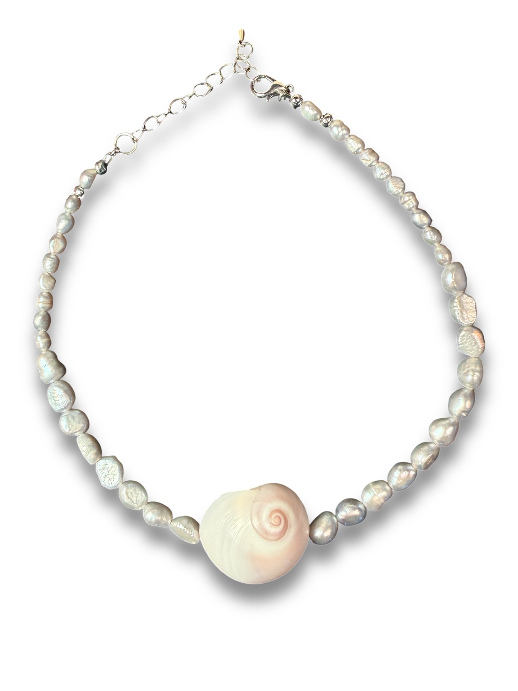 Graduated sizing real silver freshwater baroque pearls with stunning large Moonshell pendant