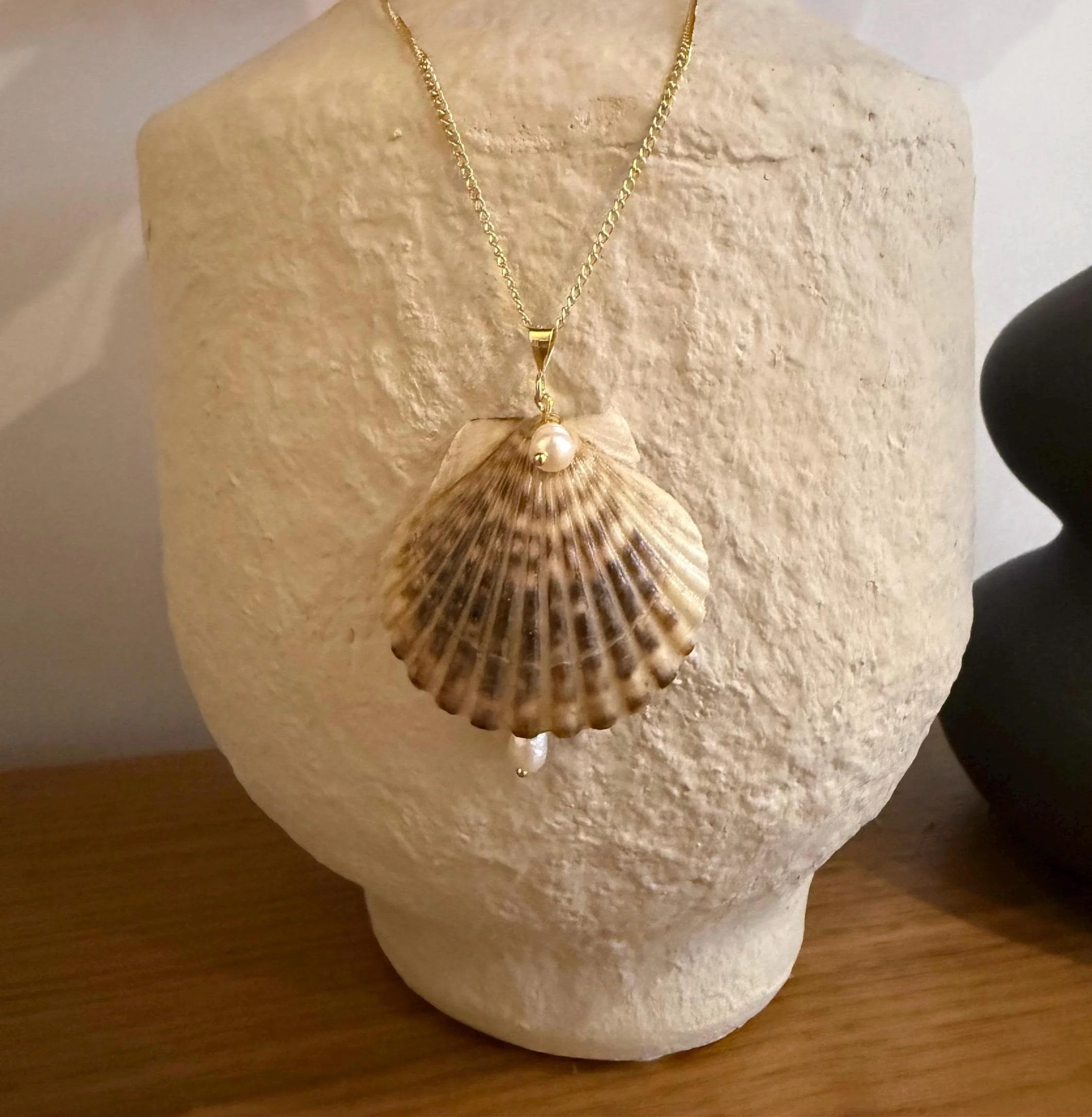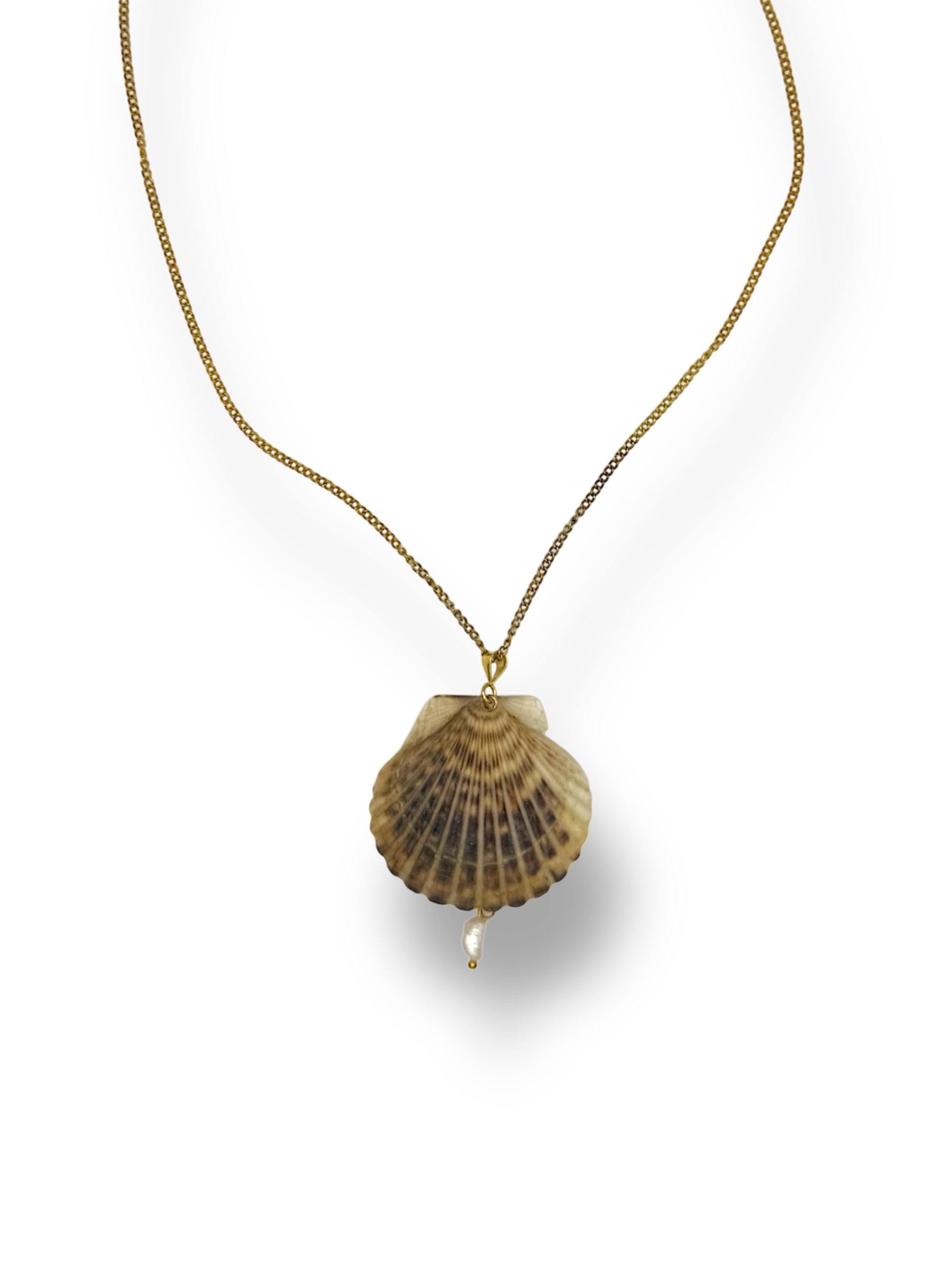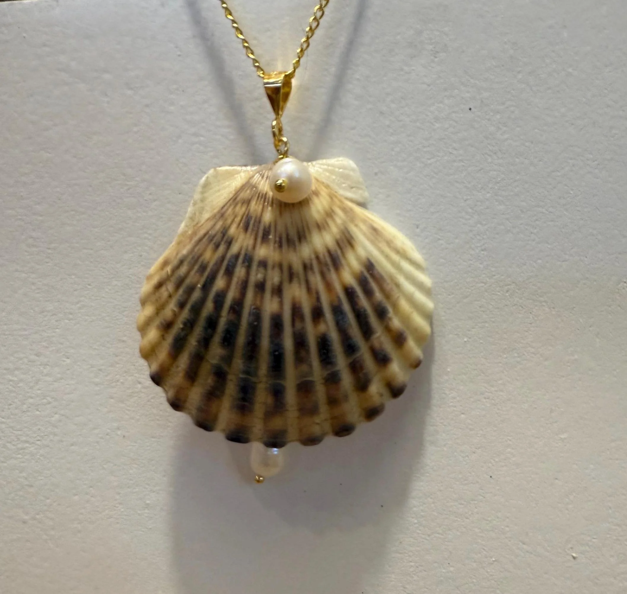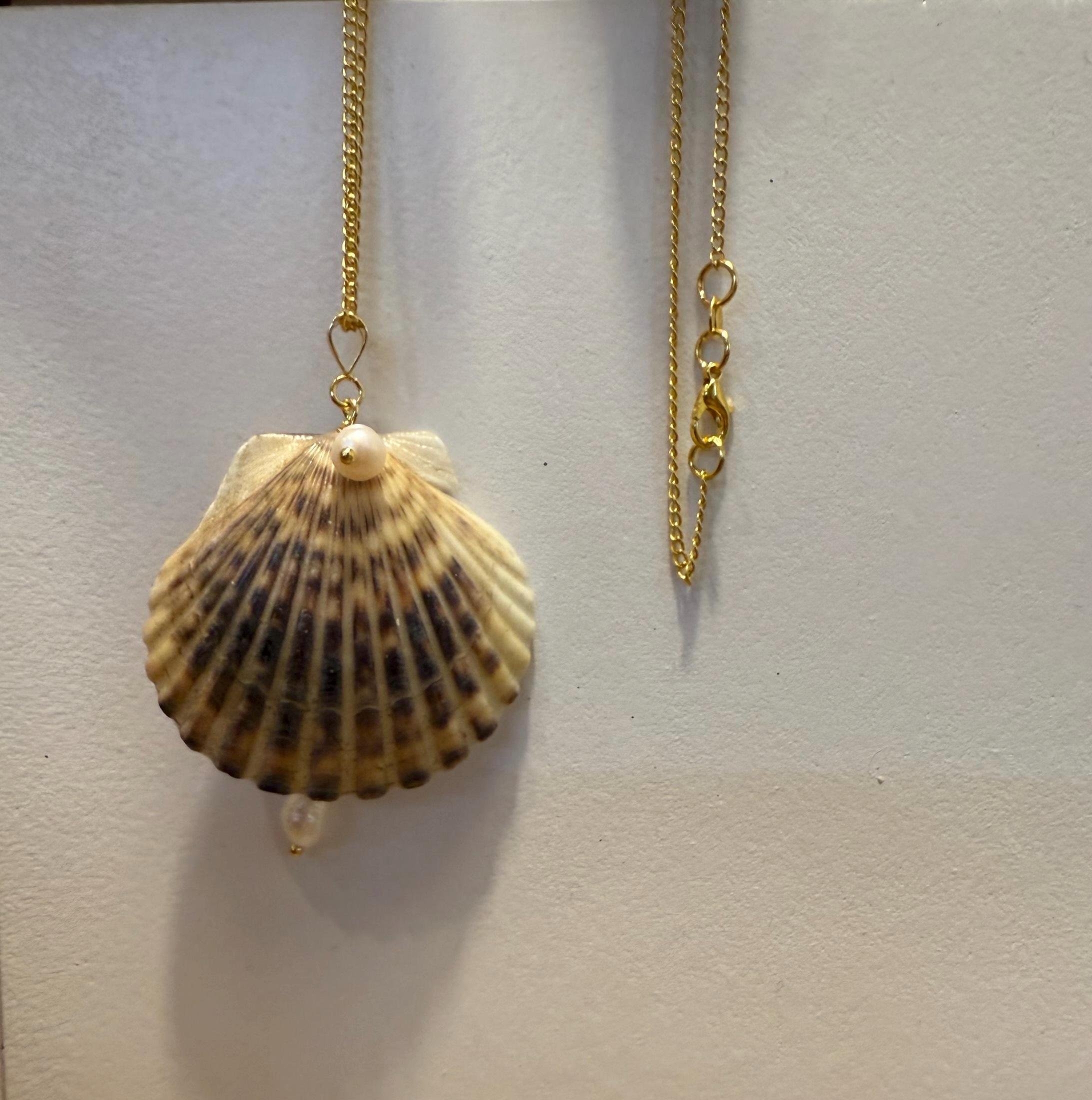 Beige Scallop Shell Pendant necklace on 24k Gold Plated Chain (24”) with real fresh-water pearl